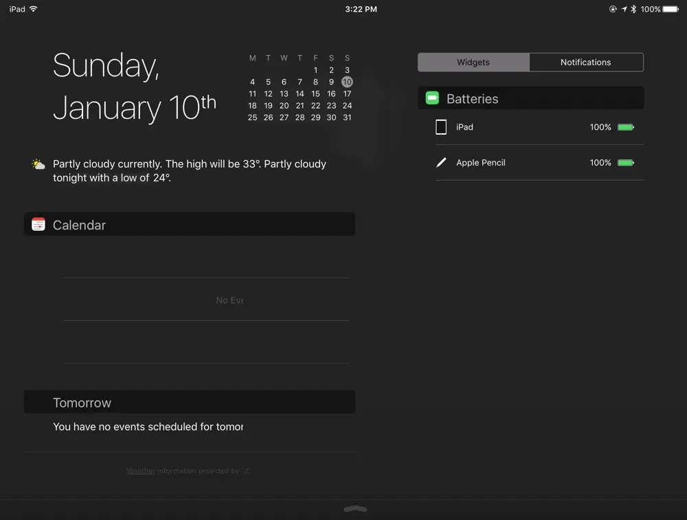 Quẹt ngón tay từ cạnh trên màn hình xuống, bạn sẽ thấy % pin của Apple pencil trong danh sách Widgets