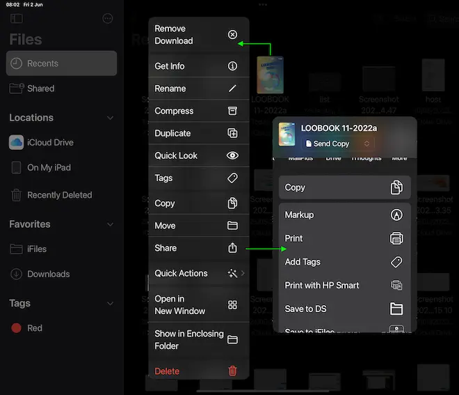 - Bước 2: chạm giữ ngón tay lên icon file để bật menu và chọn share