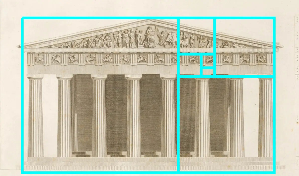 - Các đường nằm trên các cạnh hình chữ nhật khác nhau tạo nên sự cân xứng về mặt thị giác. Ví dụ như ảnh đền Parthenon minh họa ở trên.