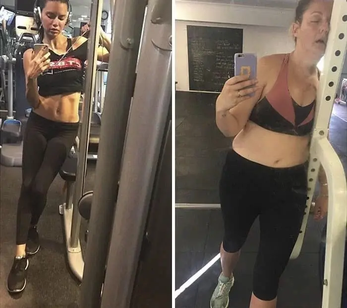 When you take a gym selfie hoping you will look toned and not like a sweaty mess. Working out is not easy, and after a difficult gym session, most people would look like the right photo.