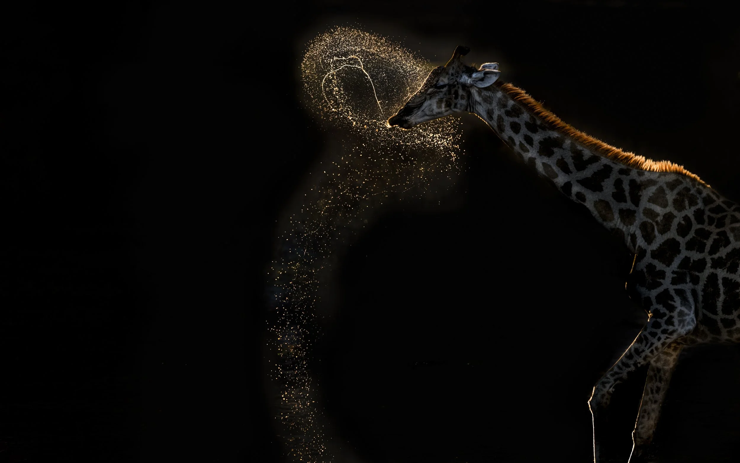 Trong khung cảnh mặt trời lặn dần trên vùng đất khô cằn Makgadikgadi ở Botswana, một con hươu cao cổ đơn độc bước đến mép nước. Cao lớn và duyên dáng, nó uốn cong đôi chân dài, cúi cổ xuống uống nước. Rồi một khoảnh khắc kỳ diệu đã đến. Sau khi uống no, con hươu cao cổ ngẩng đầu lên - và với một cú quẫy nhẹ, nó phun ra một dòng nước tạo thành một vòng cung lấp lánh trong ánh sáng vàng. Những giọt nước nhảy múa trong không trung, tạo thành một vòng tròn gần như hoàn hảo trước khi rơi xuống đất.