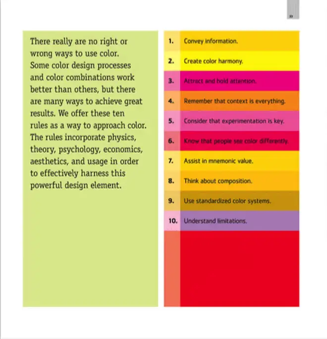 Tạm dịch "Thực hành màu sắc trong thiết kế", là một quyển sách toàn diện về màu sắc và các nguyên lý của nó. Chẵng những thế, các tác giả còn tham khảo và phân tích các mẫu thiết kế đẹp của 15 công ty hàng đầu thế giới, cho chúng ta hiểu rõ hơn về nghệ thuật sử dụng và cách thức kết hợp màu