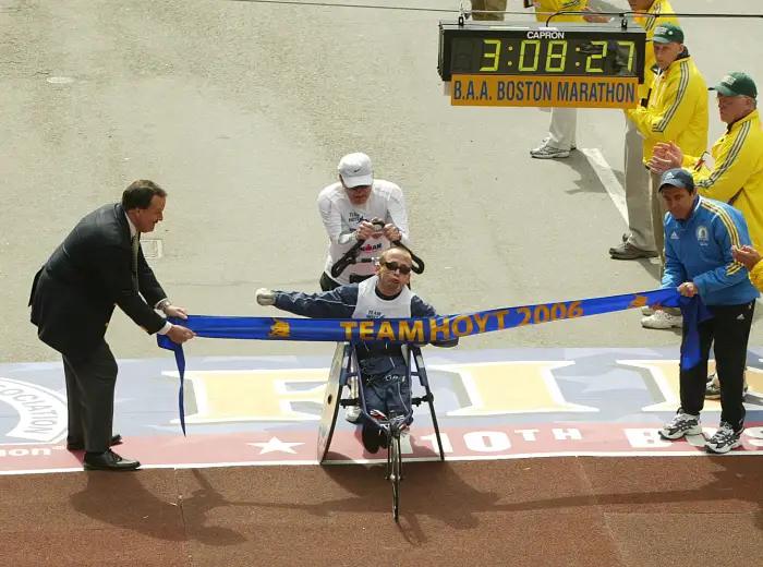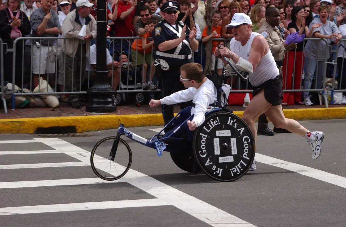 Dick Hoyt lúc đó đã 40 tuổi, bụng phệ và chưa từng chạy bộ quá 1km. Nhưng nhìn vào mắt con, ông gật đầu: "Được, bố sẽ đẩy con đi".