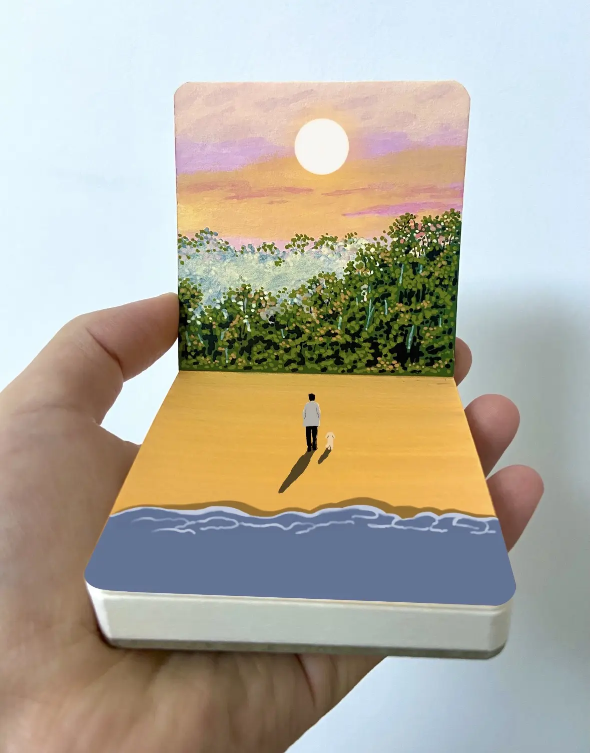 Không cần canvas lớn hay kỹ thuật cầu kỳ, anh chọn một format cực kỳ tối giản: một cuốn sổ mini mở ra ở góc 90 độ. Nhưng chính trong giới hạn tưởng chừng đơn giản đó, anh đã gợi lên cả không gian đầy cảm xúc. Như một quyển nhật ký, những gì anh vẽ trong cuốn sổ là những khoảnh khắc rất đỗi bình thường: một buổi chiều ngồi trước cửa hàng tiện lợi, ánh nắng len qua khung cửa sổ, bóng cây đổ dài trên nền sân, hay một người dắt chú chó nhỏ đi dạo. Nhưng chính sự giản dị ấy, khi được đặt vào cấu trúc hình ảnh đặc biệt, lại trở nên cuốn hút một cách lạ kỳ.