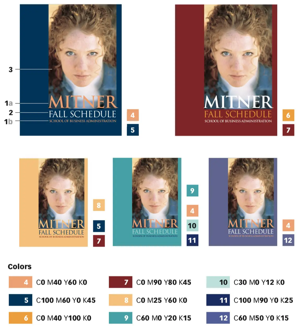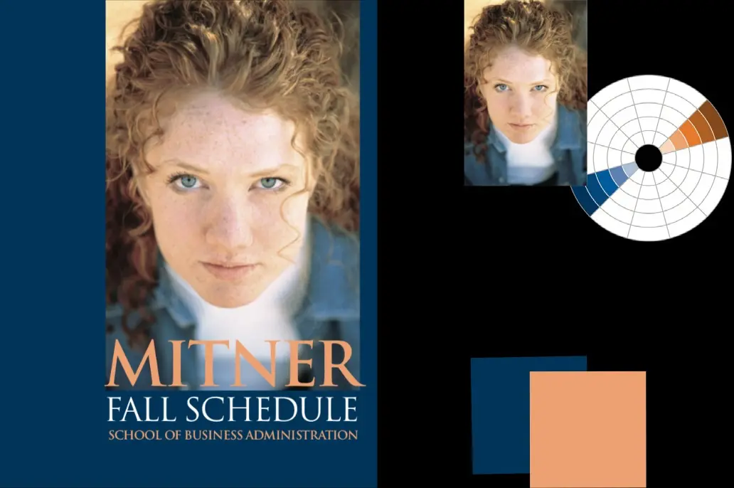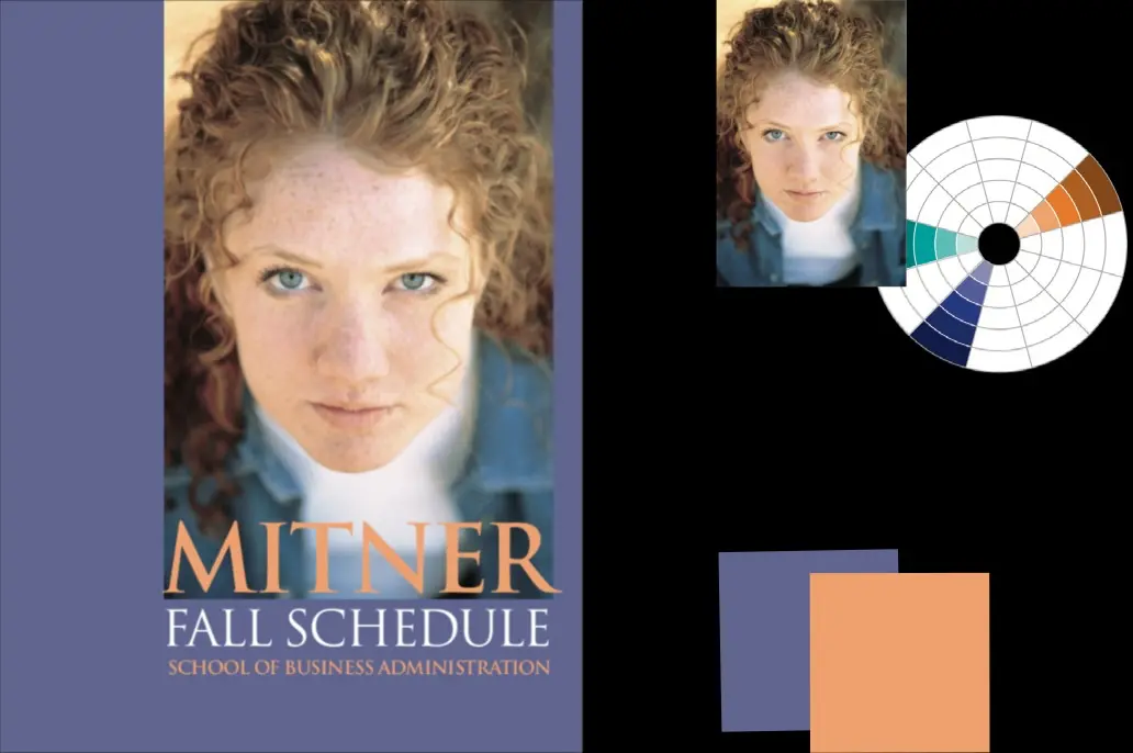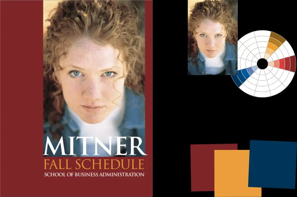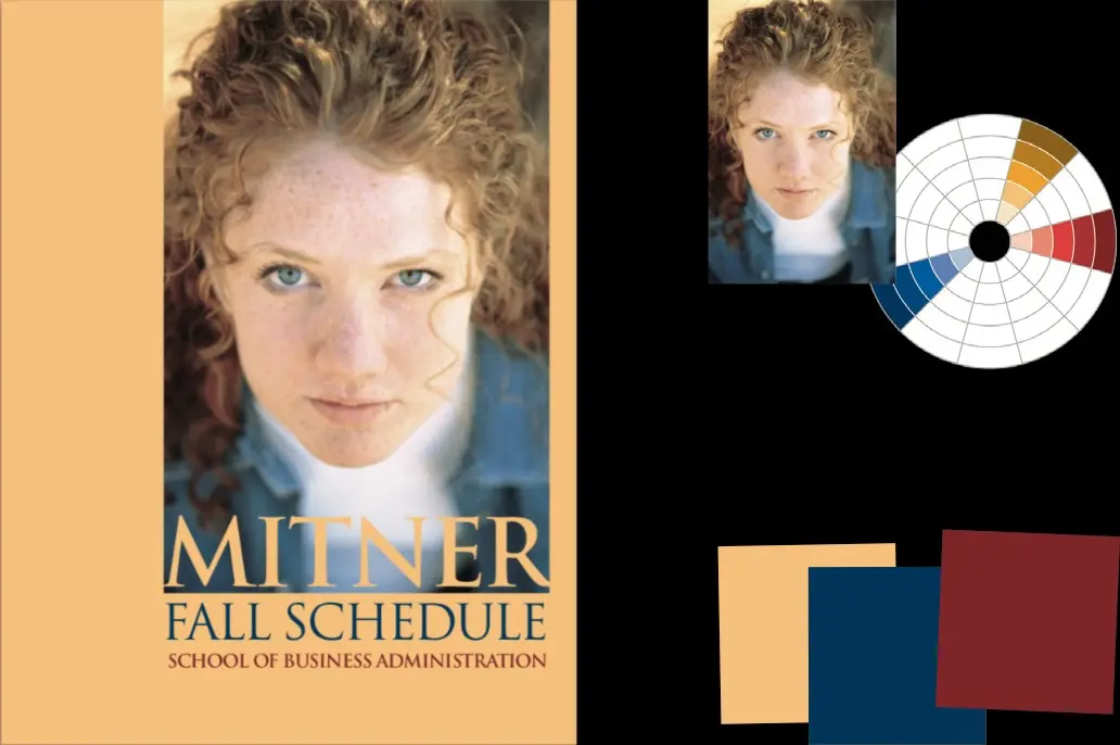 Theo hướng nghiêm túc — Bảng màu này bắt đầu bằng mảng tóc đỏ đậm của cô gái lên mảng nền, và sử dụng màu nhấn là nhánh màu vàng cách nó 2 cung trên vòng tròn màu. Mắt và áo cô gái, với màu xanh dương lùi sâu vô nền hậu cảnh, giờ lại tạo tương phản. Chú ý màu tóc đỏ cô gái chỉ là 1 mảng sáng đơn thuần, nhưng khi áp vào mảng nền trang giấy nó lại có được 1 trọng lượng thực sự. Nghiêm túc, ấm áp, lôi cuốn ánh mắt người đọc.