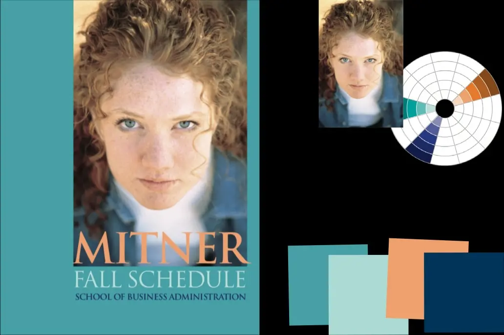 Theo hướng tình cờ — Áp mảng nền là 1 màu tương tự (Analogous) với màu xanh dương — lệch 1 cung về phía nhánh màu xanh lá cây trên vòng tròn màu— là màu xanh cổ vịt, một màu đẹp mà không có trong bức ảnh. Sự khác biệt thêm vào của nó tạo ra độ sâu, độ rung và độ nhẹ nhàng là phần nào tạo nên 1 thông điệp; Giờ nó thời trang hơn, dễ tiếp cận hơn. Mắt của cô gái, vốn là màu xanh dương, bị ảnh hưởng mảng nền giờ có 1 chút màu xanh lá cây. Màu chữ, vẫn giữ màu cam sáng, giờ thì độ tương phản của nó với nền trở nên êm hơn.