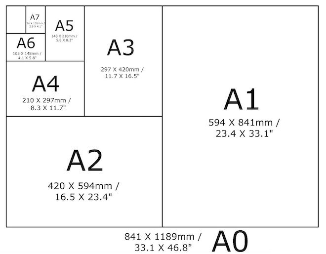 - Quy ước 2: Kích thước giấy được chia nhỏ dần từ 0, 1, 2, 3, 4, ... diện tích của cái nhỏ bằng 1/2 cái lớn theo kiểu cạnh nhỏ của size lớn bằng với cạnh lớn của size nhỏ ⟶ s0 = b1