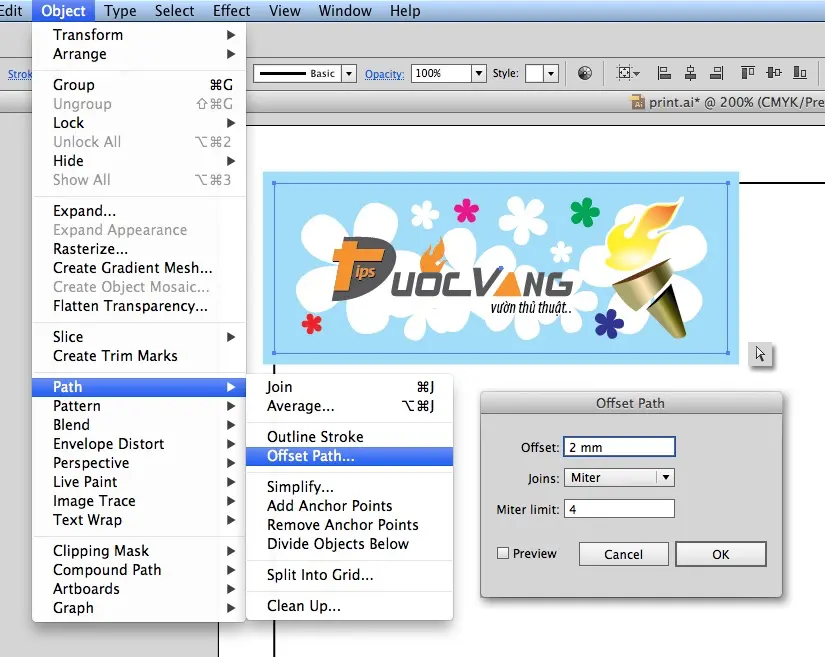 Thêm tràn lề cho mẫu: Đây là thao tác cần thiết cho các bản thiết kế có nền màu (hay nền là ảnh) để khi xén giấy ở khâu thành phẩm không bị lẹm trắng, Đối với mẫu trên, chúng ta sẽ cho nền xanh lấn ra mỗi cạnh 2 mm (lúc xén giấy nếu có lệch dao cũng không bị phạm vô nền trắng phía ngoài): Dùng Direct Selection tool click chọn nền xanh và chọn Object > Path > Offset path (Offset= 2 mm; Joins= Miter; Miter limit= 4)
