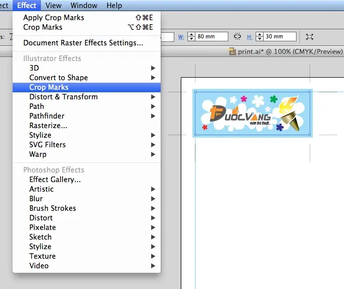 Thêm "bon cắt": Là các đường canh để xén. Dùng Direct Selection tool chọn nền xanh phía trong (không phải phần rìa tràn lề) chọn Effect > Crop Marks. Xuất hiện các đường xén là những đoạn thẳng của 4 cạnh kéo dài