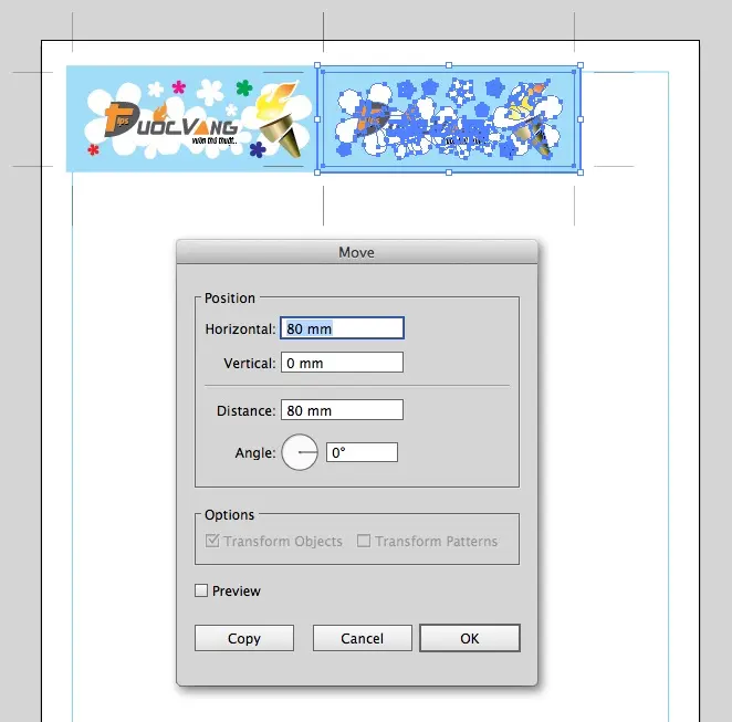 - Trong bảng lệnh Move: Position > Horizontal = 80 mm, Vertical = 0 mm. Nhấn Copy → một con của mẫu được nhân bản và dàn theo hàng ngang