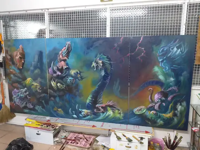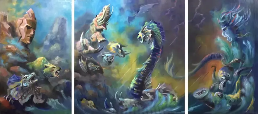 Sơn Tinh và Thủy Tinh là thần núi và thần biển phép thuật cao cường, cả hai vốn từng là bạn học của nhau cho đến khi cùng cầu hôn công chúa con vua Hùng. Sơn Tinh đem lễ vật đến trước, lấy được công chúa. Thủy Tinh nổi giận dâng nước vây đánh. Từ đó hằng năm nước lụt dâng cao là do trận chiến của Sơn Tinh và Thủy Tinh cứ diễn ra liên tục không ngừng. Tác phẩm Sơn tinh - Thủy Tinh, trận chiến bất tận được bố cục trong ba khung hình. Hai khung hình ở hai bên là các hình chữ nhật đứng, khung hình ở giữa được bố cục trong hình vuông thể hiện lại trận chiến kinh điển dữ dội của Sơn Tinh - Thủy Tinh trong kho tàng truyện cổ tích Việt Nam. Khung hình bên trái là hình ảnh núi đá với khuôn mặt của Sơn Tinh, là sơn thần, ẩn trong các đỉnh núi vươn cao rắn chắc, mạnh mẽ, bên dưới là các con thú như gấu, kỳ đà đang trong tư thế sẵn sàng nghênh chiến. Hình ở giữa là trung tâm trận chiến, là cuộc đối mặt giữa bầy thủy quái hung dữ của Thủy Tinh từ dưới biển đang ào ạt dâng lên như con thuồng luồng, cá xương vây, tôm quỷ chuẩn bị chiến đấu với các linh thú can cường đang gầm thét trên núi đá như voi chín ngà, tê giác sừng bò, trâu rừng và hổ răng kiếm của Sơn Tinh. Hình bên phải là mặt biển cuộn sóng với con quái ngư, quái vật bạch tuộc và gương mặt tức giận của Thủy Tinh thấp thoáng trong những ngọn sóng trào dâng hung tợn.