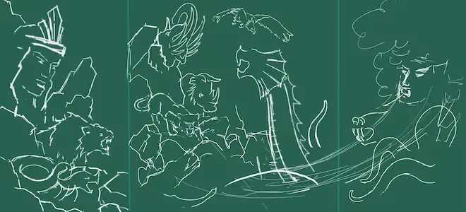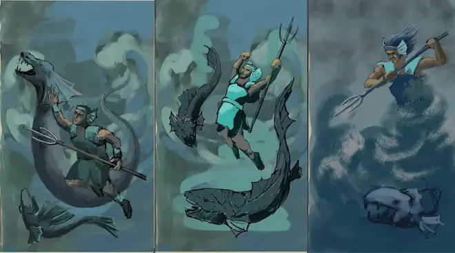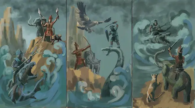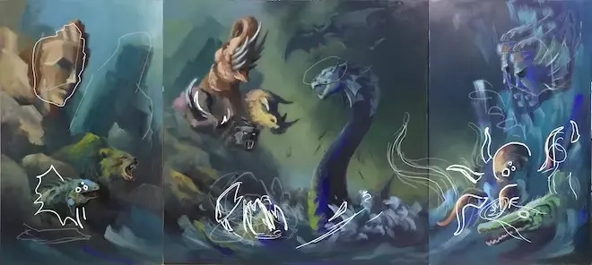 Về màu sắc, tác giả đã khai thác các sắc màu có độ tương phản cao để tăng phần kịch tính cho một trận chiến hư cấu hoành tráng vừa có trong thần thoại cổ tích vừa là lịch sử dân tộc Việt Nam ở những giai đoạn đầu hình thành đất nước. Yếu tố giả tưởng về tạo hình là hình ảnh các sinh vật hư cấu như con thủy quái và con thuồng luồng hình rồng, voi chín ngà, tê giác sừng bò, hổ răng kiếm ... đến các gương mặt các vị thần Sơn Tinh, Thủy Tinh ẩn hiện trong khối núi cao và những cơn sóng khổng lồ.