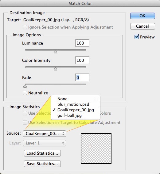 Vào Image > Adjustment > Match color.. , trong menu Source chọn ảnh nền "GoalKeeper_00.jpg". Động tác này sẽ cân màu layer "ball" theo màu nền (trong trường hợp này là thêm 1 chút màu vàng úa).