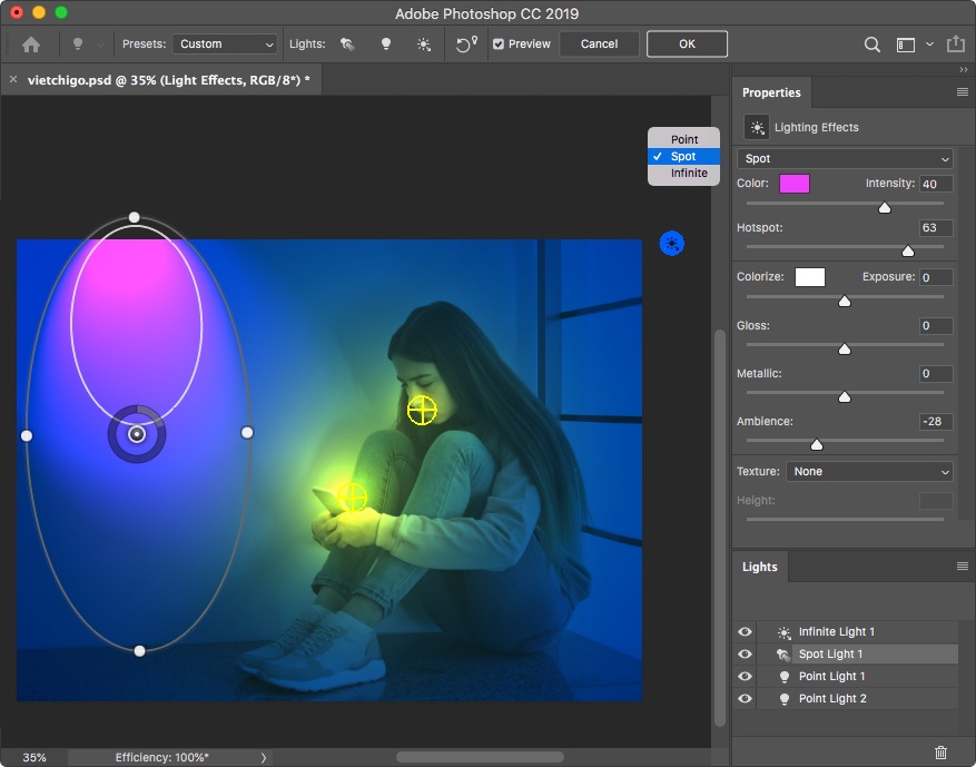 Lưu ý: Khi bạn đã thiết lập thì các Light này sẽ xuất hiện vào các lần sau. Để trở lại từ đầu bạn cho preset > default. Nhấn OK thoát ra chế độ Lighting Effect. Đóng Photoshop mà không save