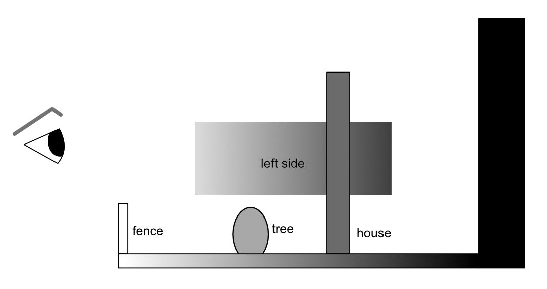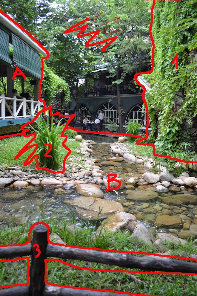 Trước tiên bạn cần phân tích các thành phần trong ảnh theo độ sâu không gian (đi sâu vào khung cảnh). Ở bức tranh trên, mình tách thành 6 mảng theo nguyên tắc các đối tượng càng xa sẽ càng đen
