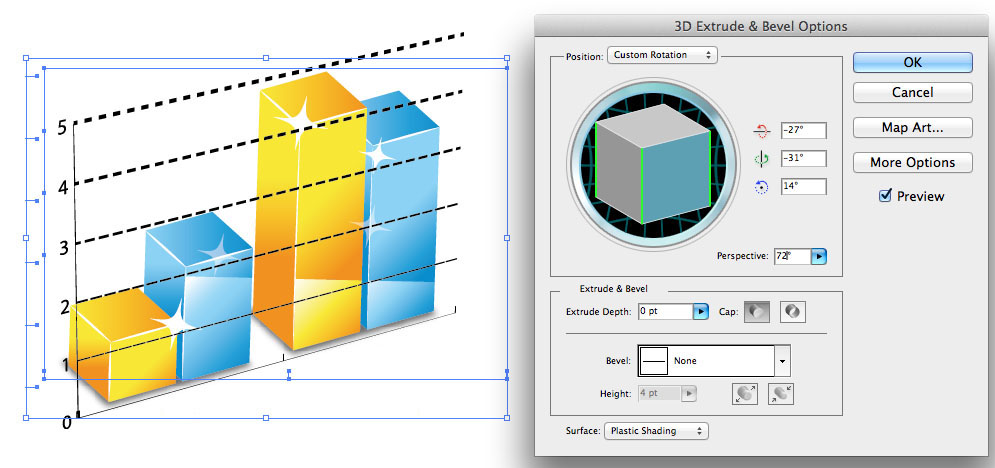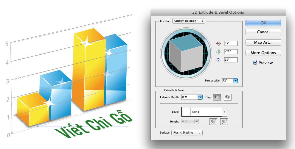 Bước 2: Tạo phối cảnh cho đồ thị bằng lệnh Effect > 3D > Extrude & Bevel thông số theo hình dưới đây.