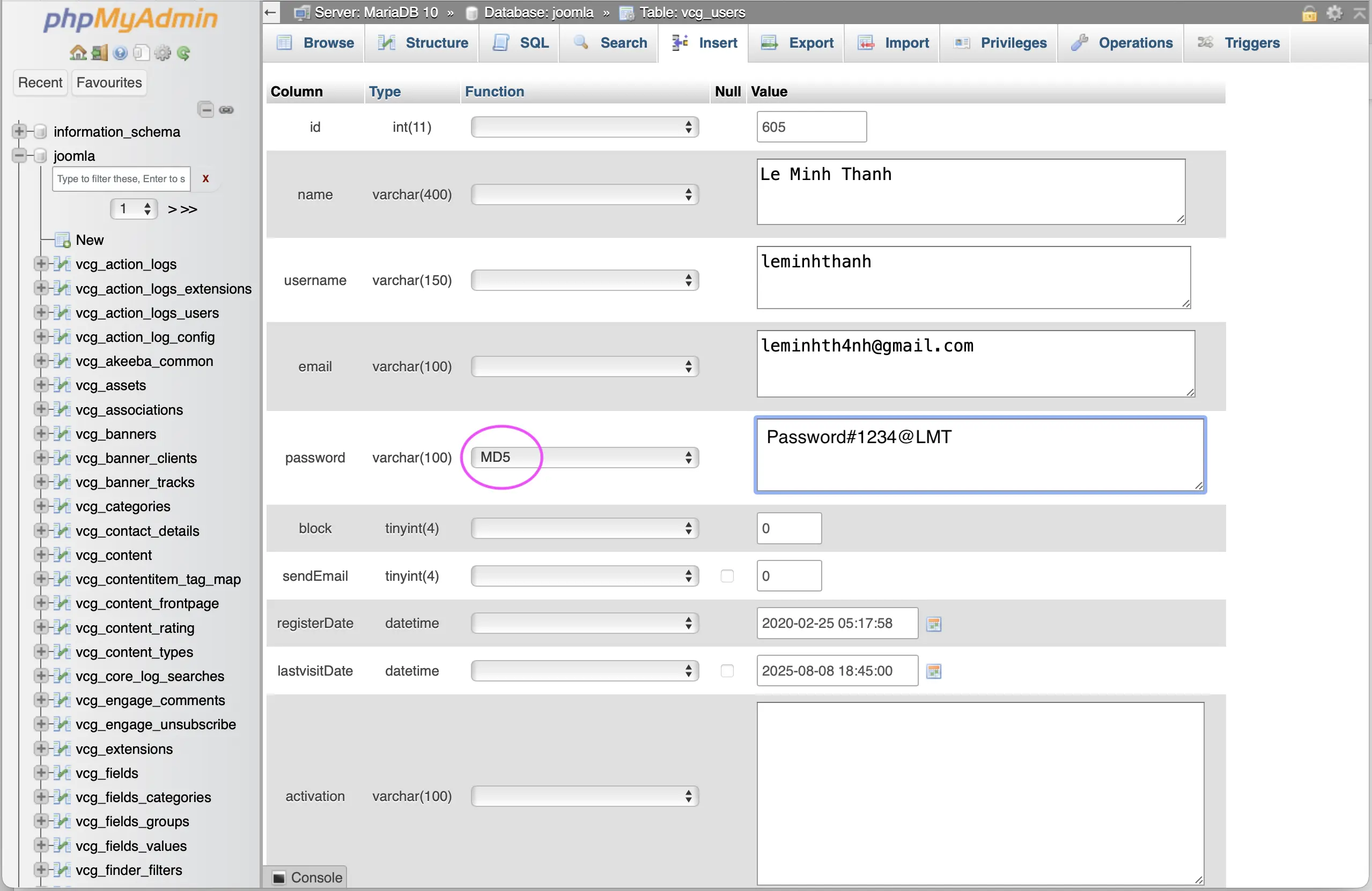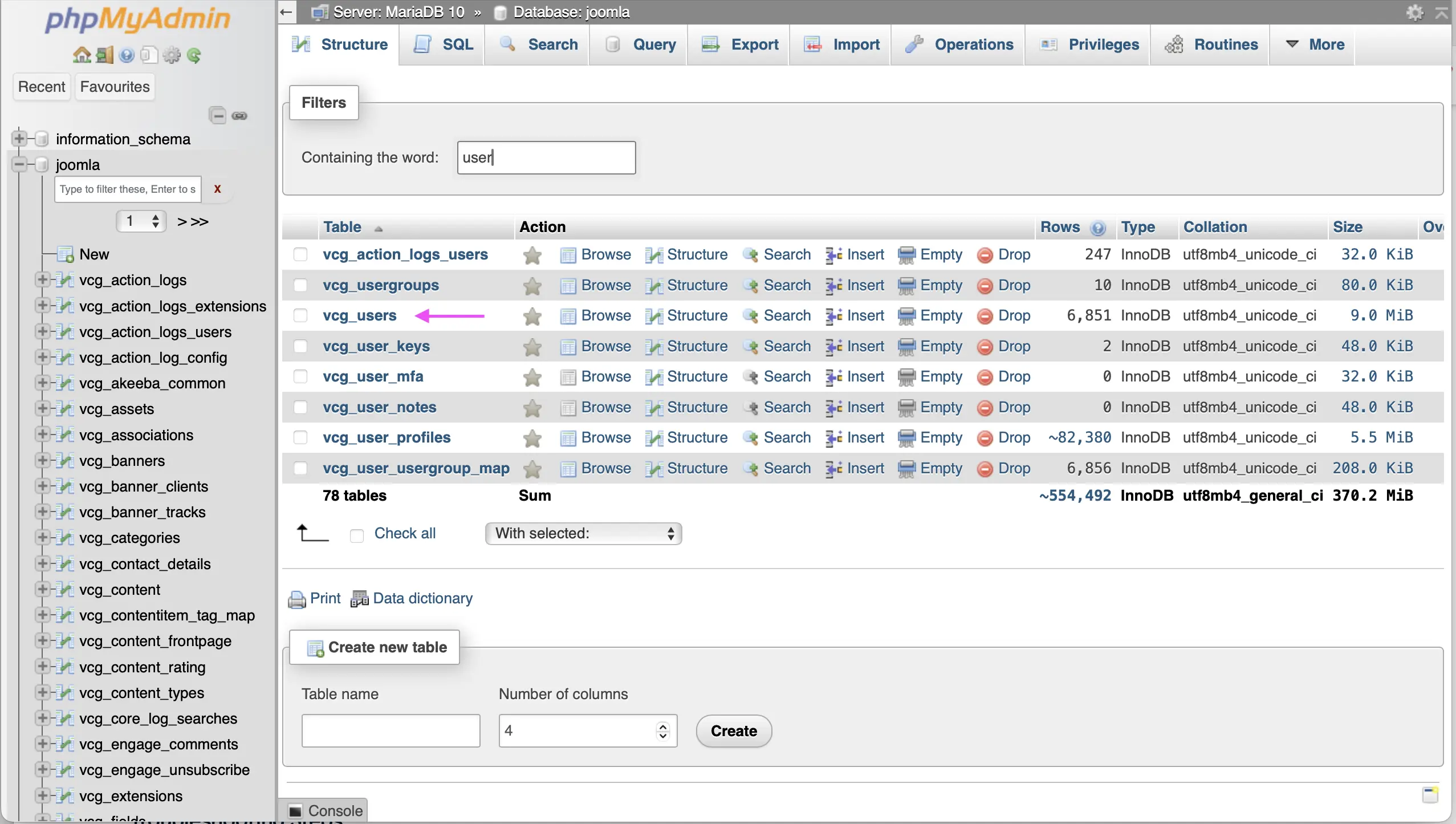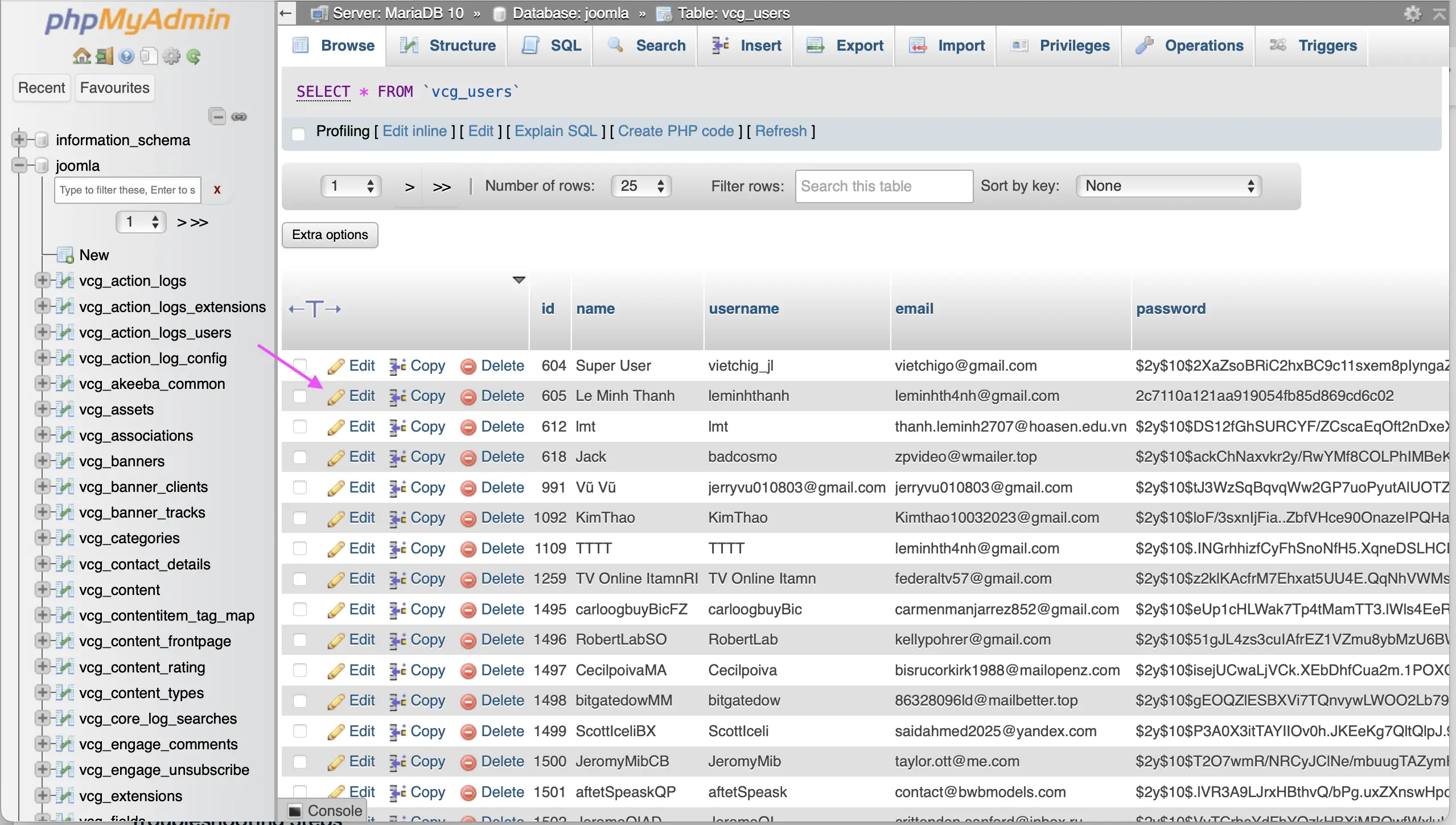 Bước 1 - Đăng nhập vào phpMyAdmin, tìm và mở table "..user".