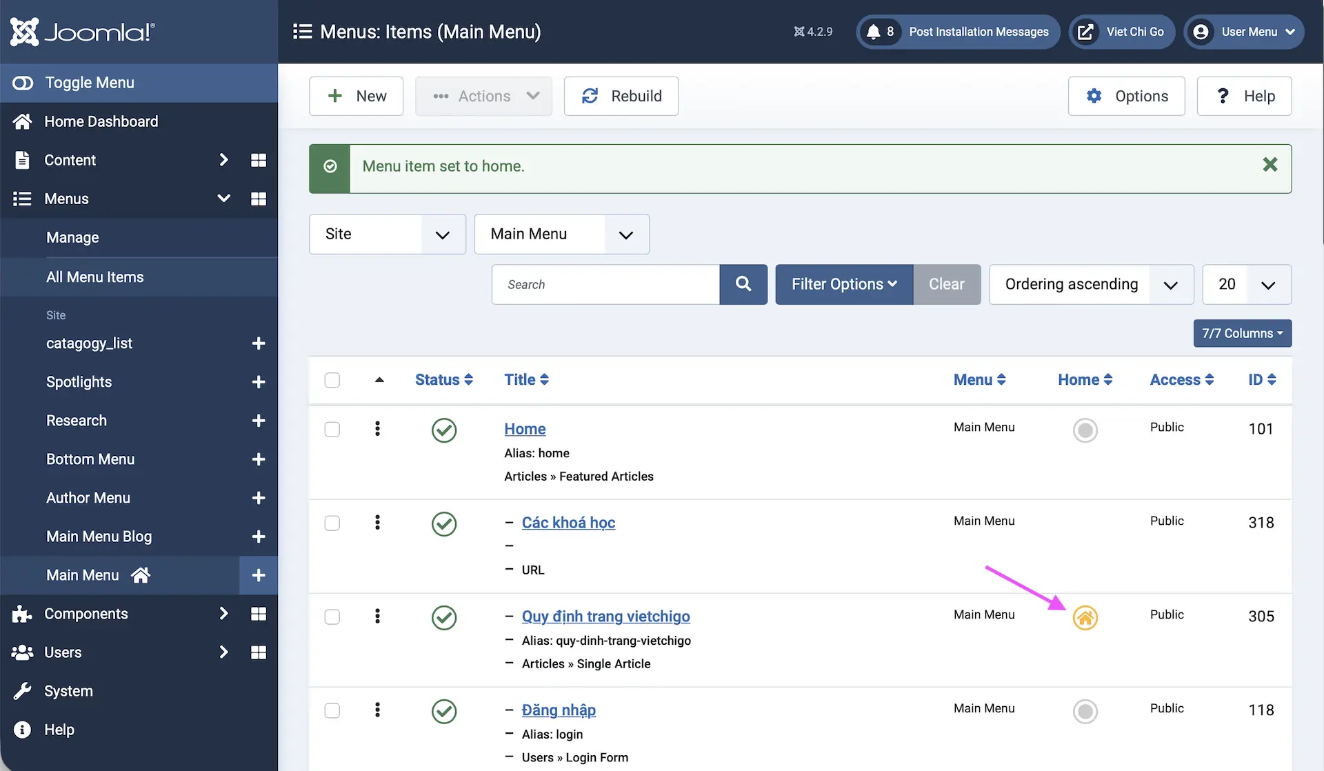 Vào Menu: Main menu. Click icon ngôi nhà ở trang nào mà bạn muốn nó sẽ là trang mặc định của website