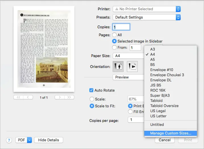 Chọn Page Size > Manage Custom Sizes và nhập Page size vừa với kích thước ảnh. Nhớ giảm margin về 0